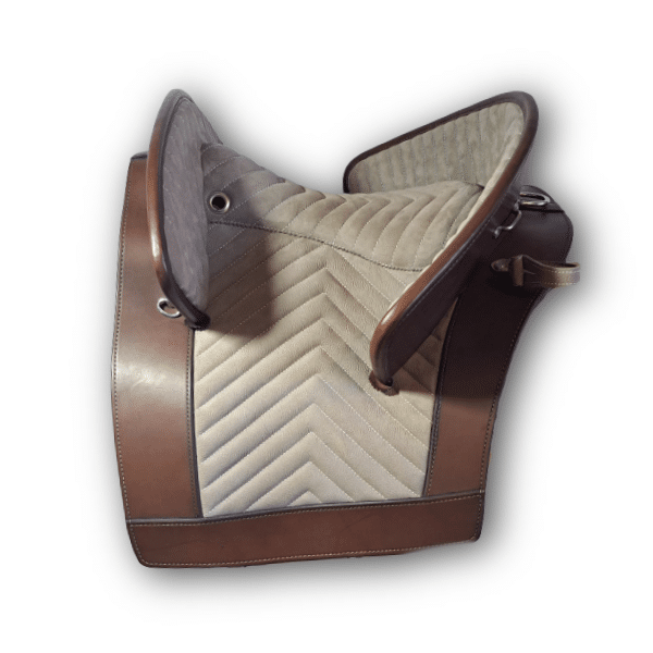 UF/VSK. Size: 2. Saddle Leather: Havanna Antique. Seat Leather: Dolomiti Nubuck. Front and Back Gallery: Dolomiti Nubuck. SKL: Dolomiti Nubuck. Panels: Brown Nappa. Stitching: White. Stirrup Loops Holders: Dolomiti Nubuck. Hardware: Silver, D-Rings, Footman Loops. Billets: Dolomiti. Channel: 8cm. Flocking: Medium. Makerplate: DP Saddlery Silver.