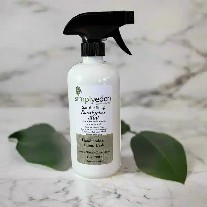 Simply Eden’s Equine Naturals glycerin saddle soap has been formulated in collaboration with Adrienne Hendricks Saddlery! So, be assured that your leather wares are being cleaned and cared for gently, restoring moisture and reviving your leather goods. Please test first on an inconspicuous area prior to use. Handmade using our own formula, nontoxic, no petroleum, all natural, glycerin saddle soap with no detergents. Our spray formulation Cleans and conditions in one step and makes daily tack cleaning a breeze! Available in Eucalyptus Mint, Sunshine Daydream, Lavender, or Unscented. Sold with cap for shipping with spray nozzle included (but not pictured). 16 oz/475 mL